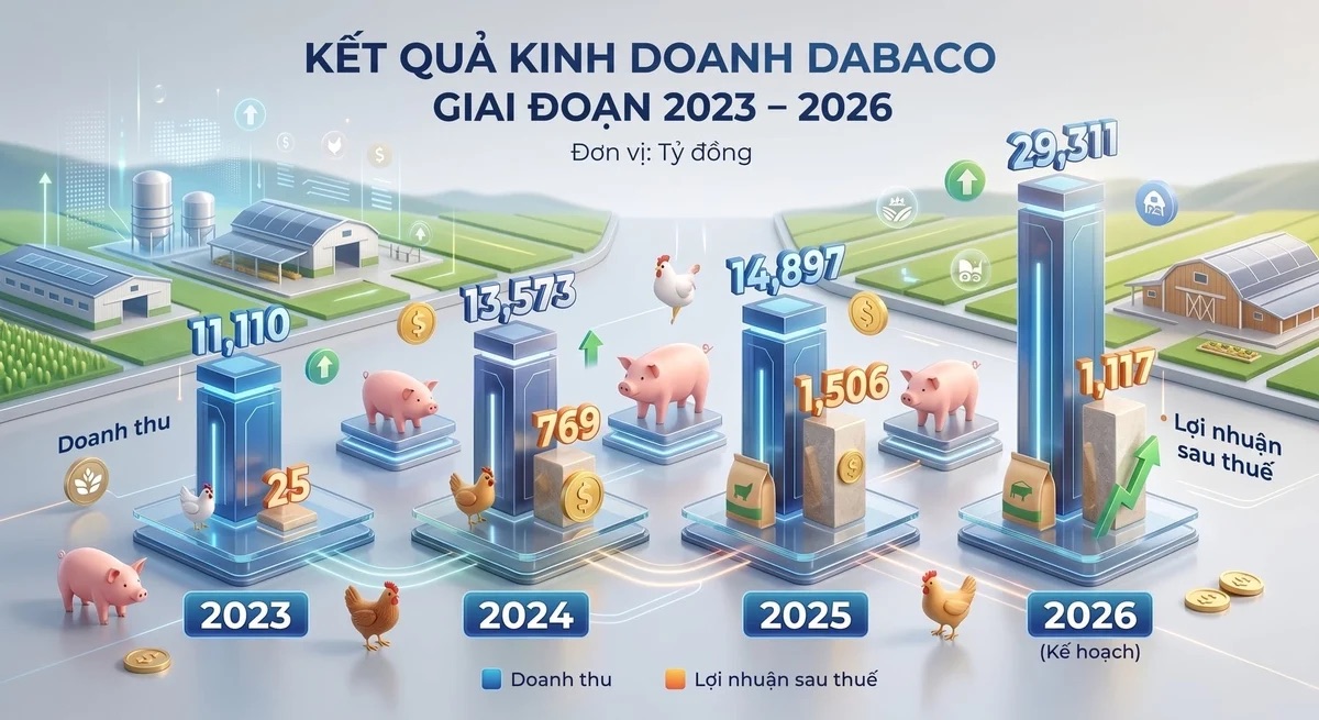 Trong bối cảnh đó, năm 2026, Dabaco đạt mục tiêu doanh thu 29.311 tỷ đồng (hơn 1 tỷ USD), tăng 22% so với thực hiện năm 2025 và là mức doanh thu kế hoạch kỷ lục trong lịch sử hoạt động của tập đoàn; lợi nhuận trước thuế 1.261 tỷ đồng, lợi nhuận sau thuế 1.117 tỷ đồng.