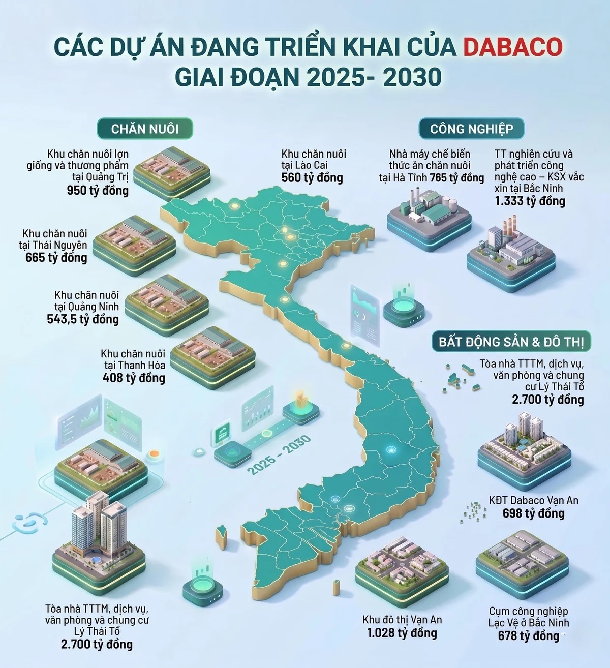 Bất động sản khu công nghiệp, Dabaco có cụm công nghiệp Lạc Vệ ở Bắc Ninh quy mô 48ha, vốn đầu tư 678 tỷ đồng. Với 15 dự án lớn, tổng vốn đầu tư cho giai đoạn 2025 - 2030 vào khoảng 12.347 tỷ đồng.
