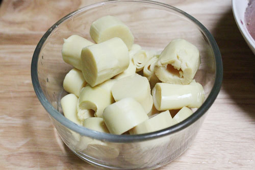 - Măng tươi cắt bỏ đoạn già, thái khúc vừa ăn.