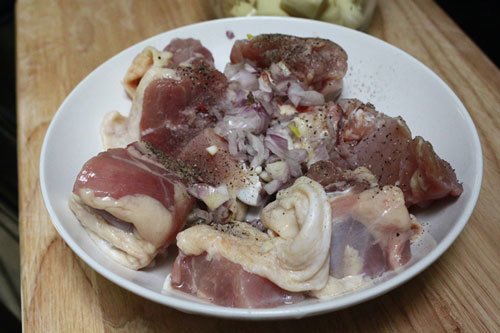 - Chặt gà thành miếng vừa ăn. Ướp vào gà hành hương đã bằm nhuyễn, thêm khoảng một thìa nhỏ nước mắm, nửa thìa hạt nêm, chút xíu hạt tiêu. Ướp trong vòng 1 tiếng.