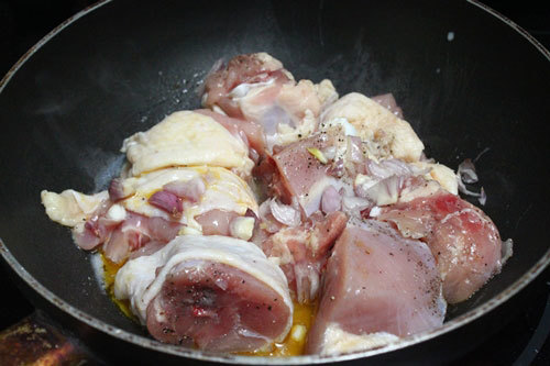 - Đun nóng hai thìa nhỏ dầu điều, phi tỏi thơm, đổ gà vào chiên vàng hai mặt.